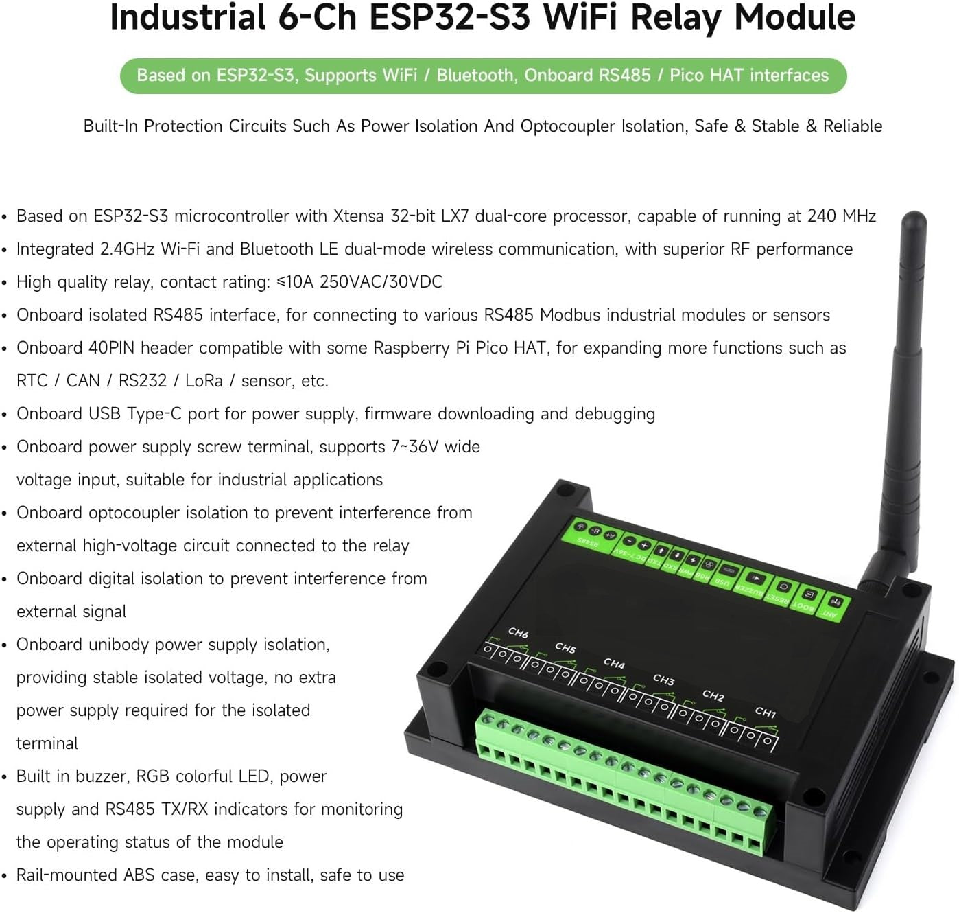 ESP32-S3 WiFi Relay Module, Supports WiFi / Bluetooth / RS485 control, Onboard RS485.