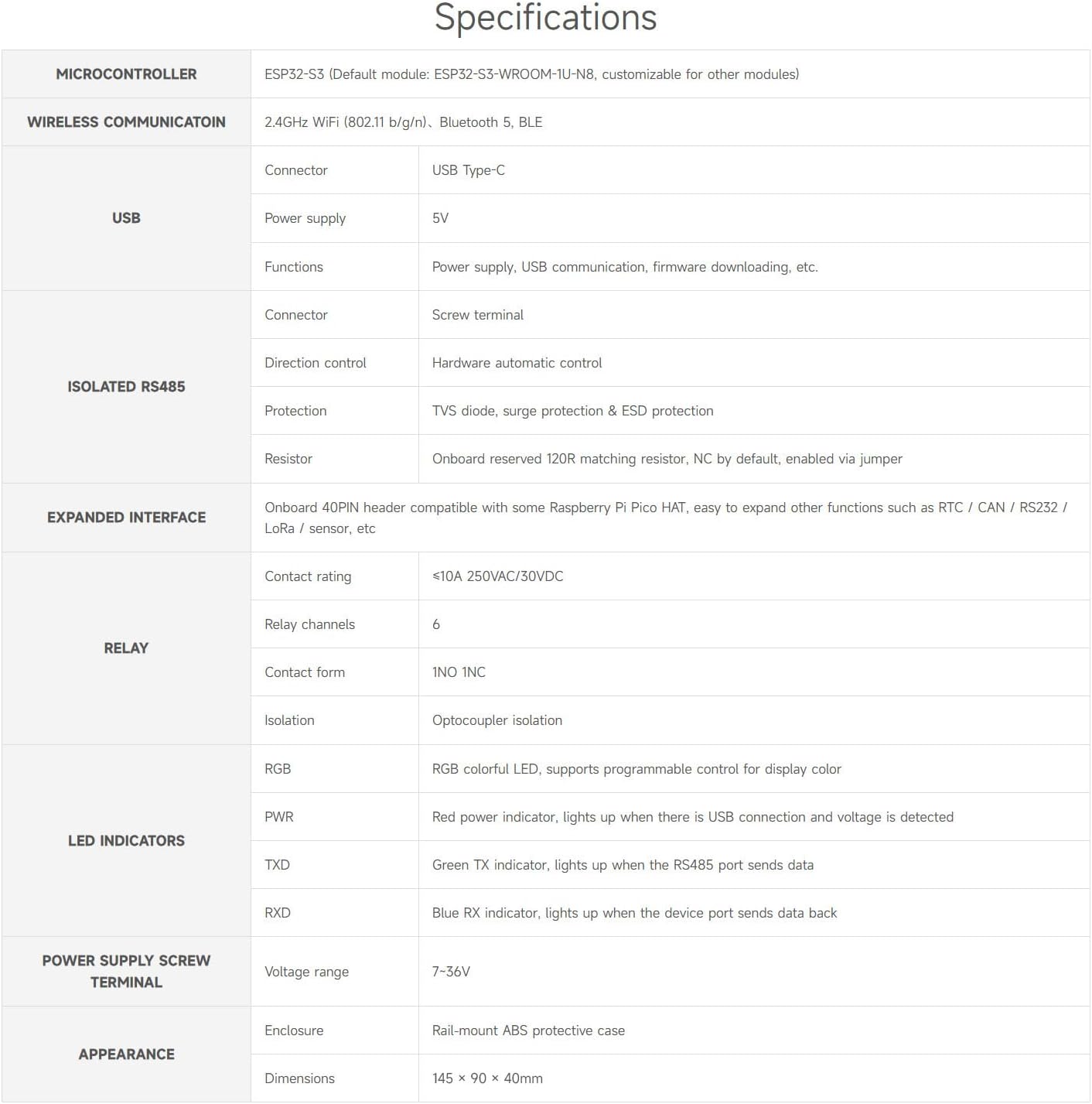 - Built in buzzer, RGB colorful LED, power supply and RS485 TX/RX indicators for monitoring the operating status of the module
